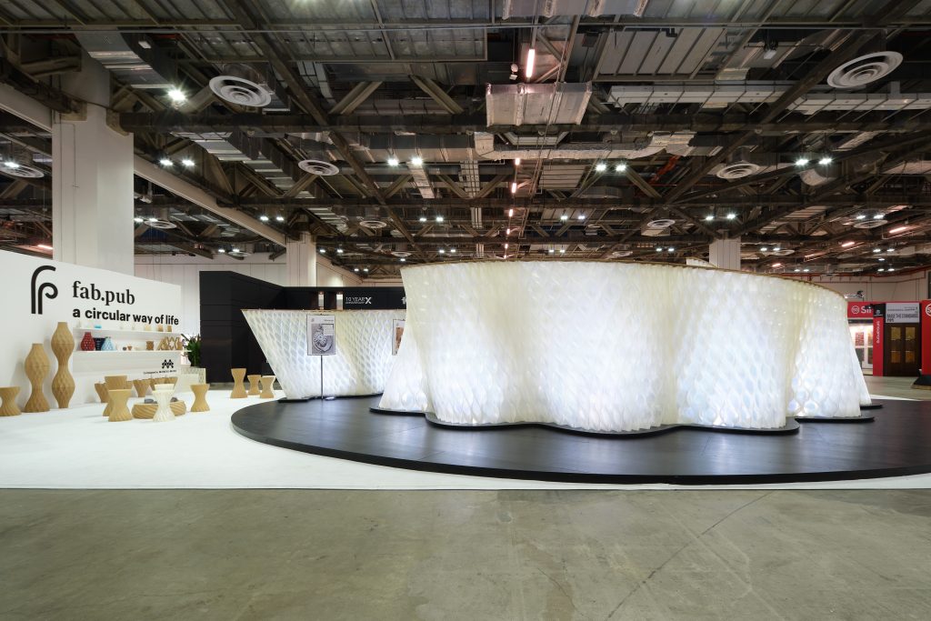 Altostrata 在新加坡设计周上亮相,是一个由可堆肥糖基 PLA 制成的 3D 打印展馆。它展示了移动 3D 打印平台 Fab.Pub 的循环设计原则:减少、重新利用、再利用和回收。该结构展示了废物最小化和可持续资源利用。其面板灵活且可重新配置,便于运输和多样化的功能。