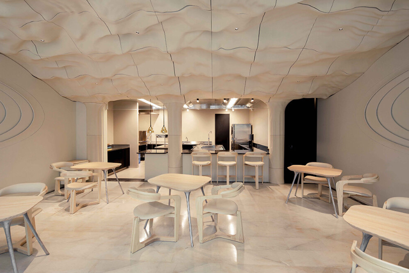 餐厅面积为 85 平方米,可容纳 16 位客人,将传统烹饪与前沿设计融为一体。餐厅的焦点是天花板,它由定制的 3D 打印模块组成。这些白色有机形状由木材废料制成的可持续纤维素复合材料制成,让人联想到沐浴在温暖阳光下的白雪皑皑的宁静景观。