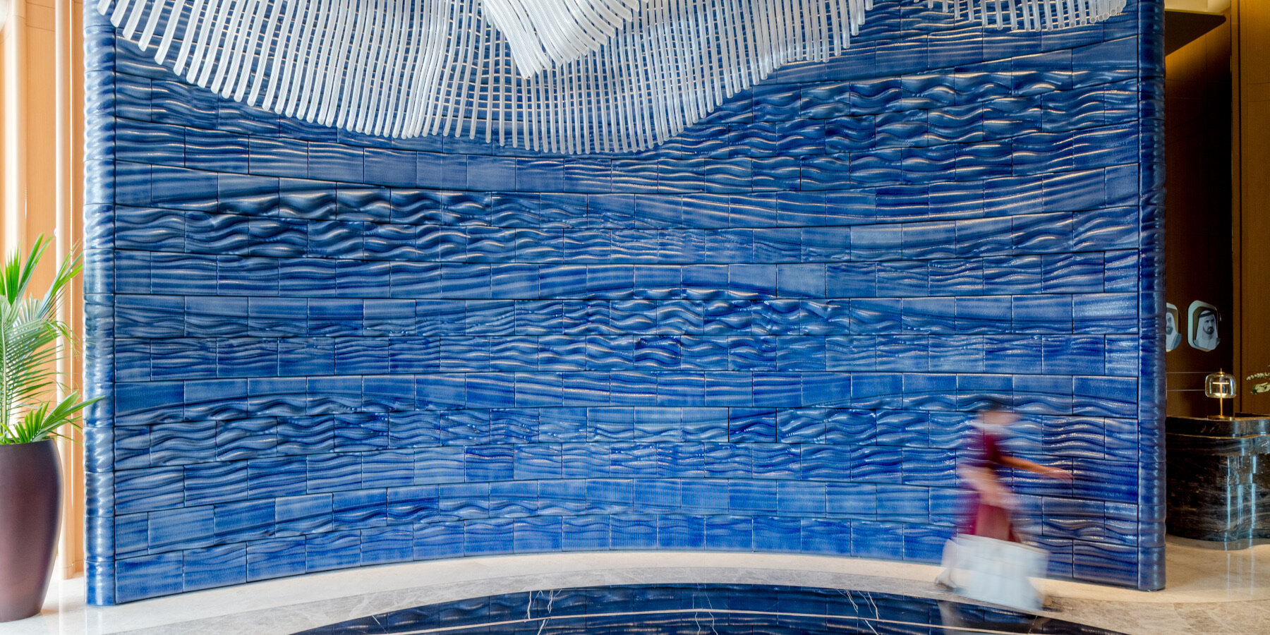 Studio RAP在迪拜卓美亚阿拉伯酒店完成了一项大型3D打印陶瓷装置艺术作品。该项目名为“蓝色航程”,由位于酒店大堂入口处的两面陶瓷墙组成。每面墙高6米,长9米。