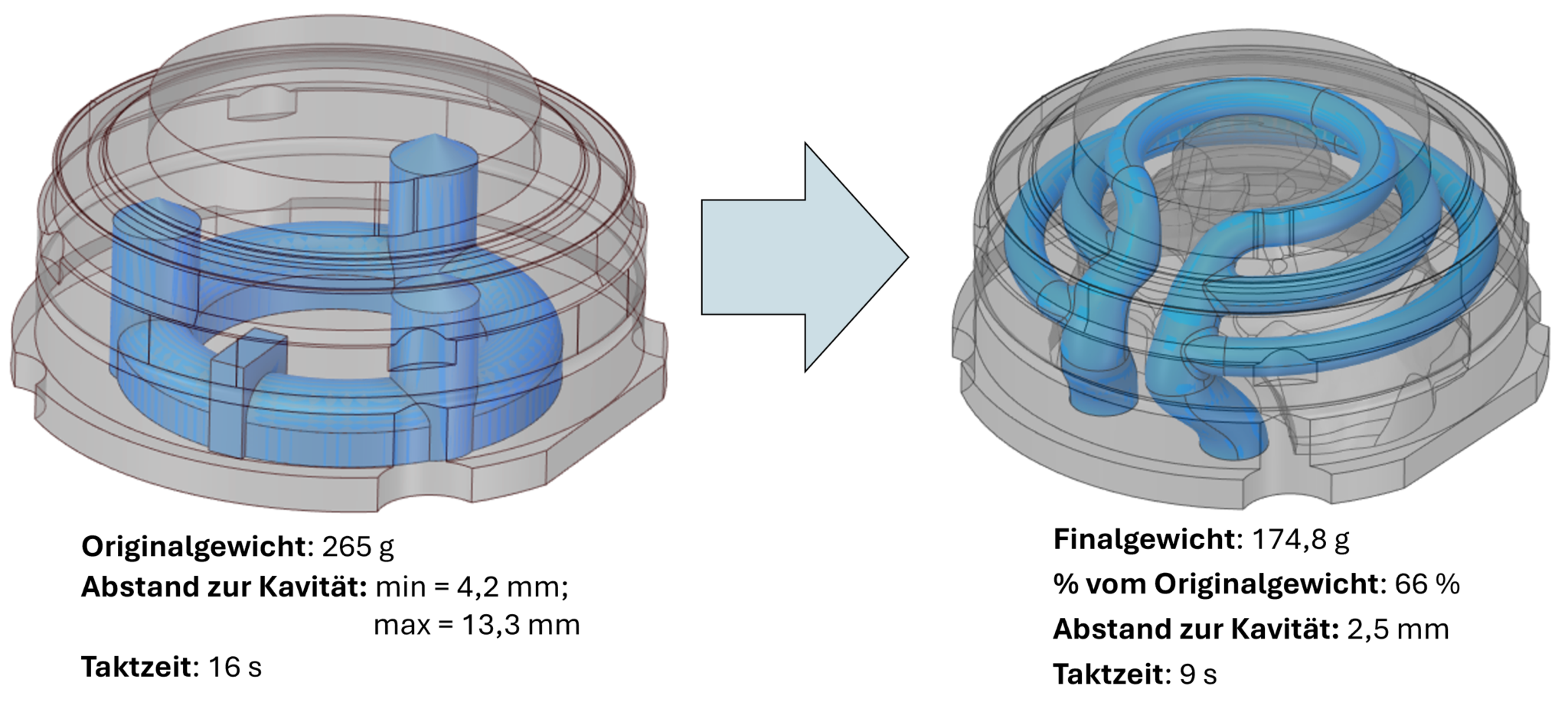 得益于AdTopoTool,模具重量显著减轻,从265克降至174.8克。注塑模具示例(左:原始模具,右:拓扑优化后的模具)。图片来源:弗劳恩霍夫IWU研究所