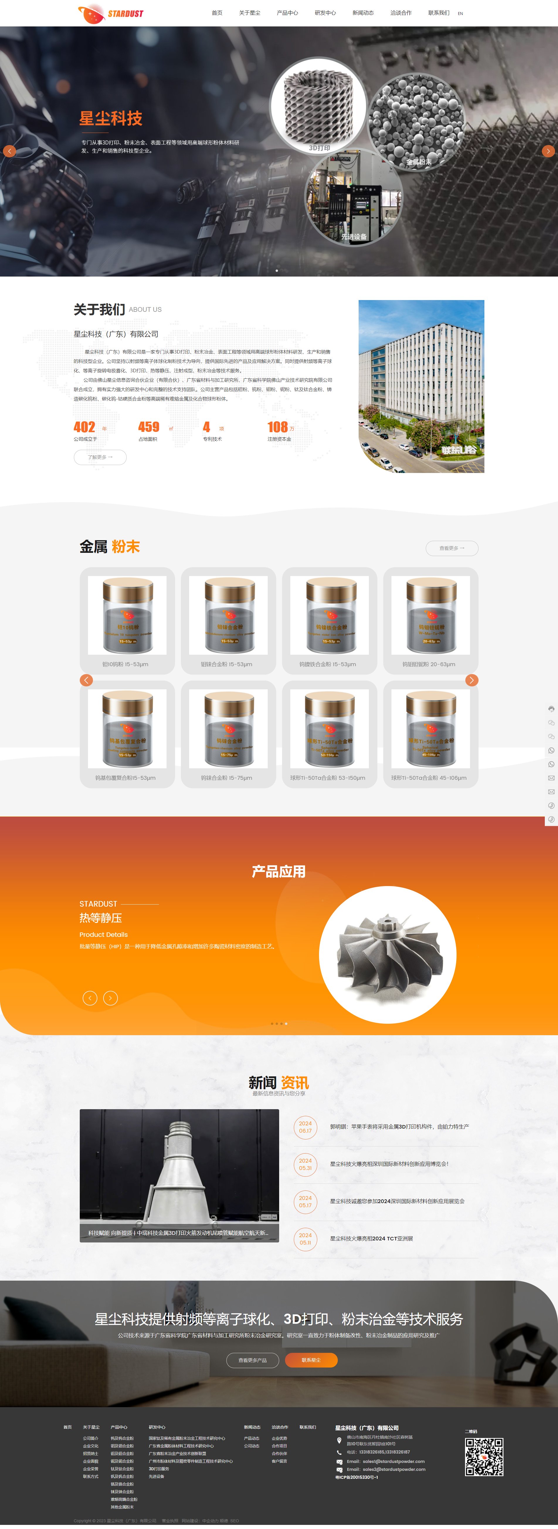 星尘科技(广东)有限公司是一家专门从事3D打印、粉末冶金、表面工程等领域用高端球形粉体材料研发、生产和销售的科技型企业。公司坚持以射频等离子体球化制粉技术为导向,提供国际先进的产品及应用解决方案。同时提供射频等离子球化、等离子旋转电极雾化、3D打印、热等静压、注射成型、粉末冶金等技术服务。